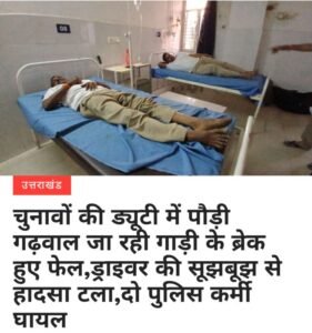 पौड़ी चुनाव ड्यूटी में लगी गाड़ी हुयी दुर्घटना ग्रस्त चालक की सूझबूझ से टला बड़ा हादसा दो पुलिस कर्मी घायल